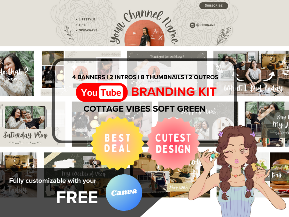 Youtube Branding Kit | Editable Intro, Banners, Thumbnails, Outro | Editable Canva Template | Cottage Vibes Soft Green