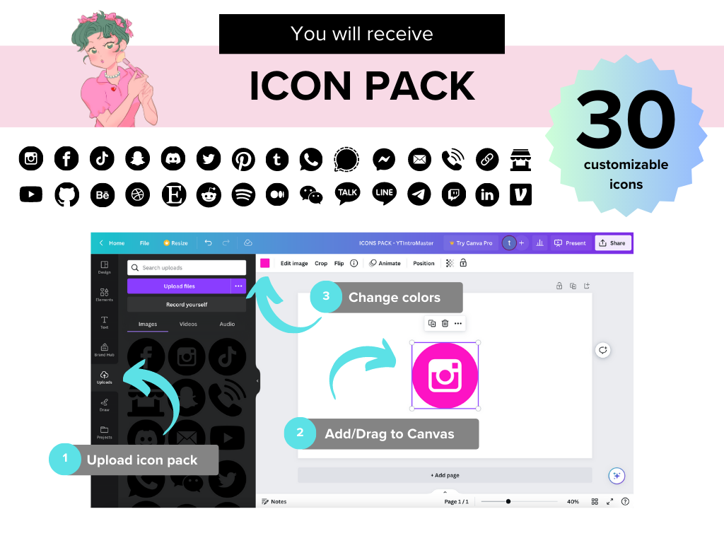 Once you've successfully completed the purchase, you will receive 2 files - 1 PDF file with clickable links that give you access to all the templates, and a zip file containing all the 30 icons.